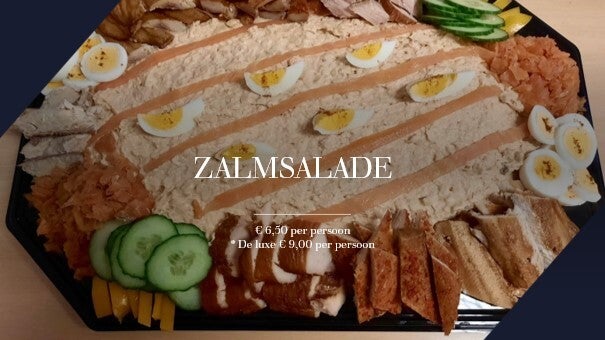 Wilt u liever een salade voor bij de lunch, gourmet of BBQ? Dan bieden wij een heerlijke zalmsalade aan met bijpassend visgarnituur. Met de ''de luxe'' variant geniet u van extra hollandse garnalen & paling. De zalmsalade bieden wij aan vanaf €6,50 per persoon.